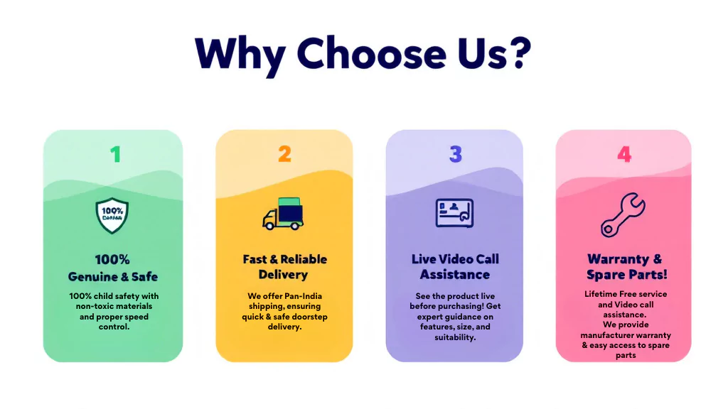 ISAKAA guarantees 100% genuine products, home delivery all over India, and COD and online payment options. To ease the job of parenting, each product is accompanied by a warranty, after-sales video support, and easy availability of spare parts, because fun should never stop.